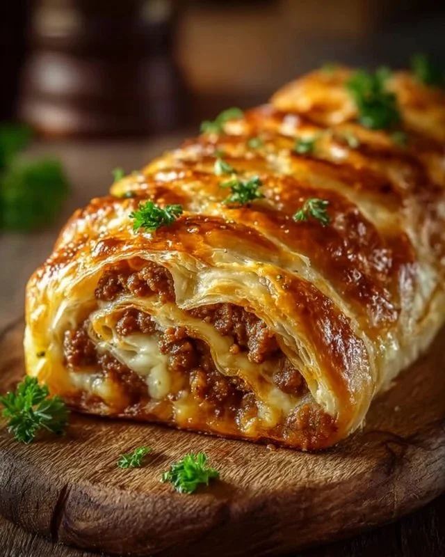- Place the beef mixture in the center of the pastry and shape it into a log.