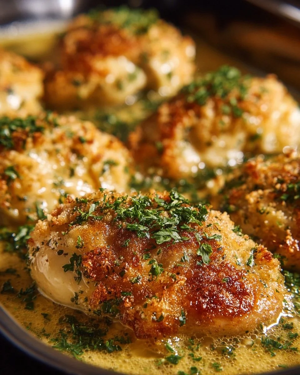 - Pour the garlic-Parmesan sauce over the chicken, ensuring each breast is well coated.