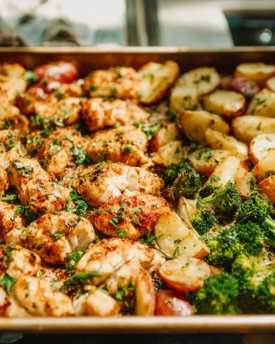 At a glance: you’ll toss chicken and chopped potatoes in a garlicky Parmesan oil, spread everything in one layer on a sheet pan, then roast until the chicken reaches a safe internal temperature and the potatoes are tender and browned. No pre-cooking required. Expect about 10 minutes active prep and 25–30 minutes in the oven.