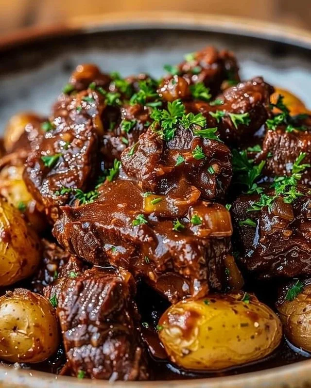 Enjoy tender chunks of chuck roast braised in a rich, garlicky butter-herb sauce with Yukon Gold potatoes. A comforting one-pot meal perfect for busy weeknights.